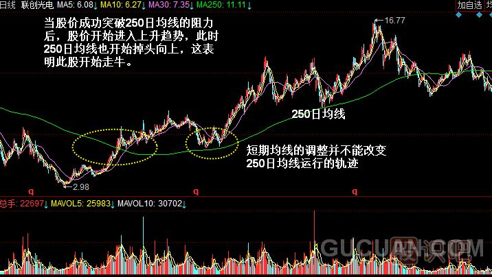 由于250日均線(xiàn)周期較長(cháng),無(wú)法指導短線(xiàn)操作,所以一般都被用來(lái)判斷大盤(pán)趨勢。