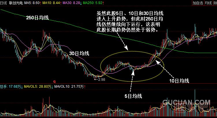 當250日均線(xiàn)向上傾斜時(shí),說(shuō)明近一年來(lái)買(mǎi)人股票的投資者開(kāi)始贏(yíng)利,此時(shí)多方主力為行情的主導力量;當250日均線(xiàn)向下傾斜時(shí),說(shuō)明近一年來(lái)買(mǎi)人股票的投資者處于被套狀態(tài),此時(shí)空方成為行情的主導力量,當250日均線(xiàn)走平時(shí),表示多空雙方處于膠著(zhù)狀態(tài),后期趨勢如何難以預料。當250日均線(xiàn)出現拐頭時(shí),表示250日均線(xiàn)出現了重大的變化,在下跌趨勢后期如果250日均線(xiàn)向上拐頭,表明市場(chǎng)將由空翻多;而如果在上升趨勢后期250日均線(xiàn)開(kāi)始向下拐頭,表明市場(chǎng)將由多翻空。