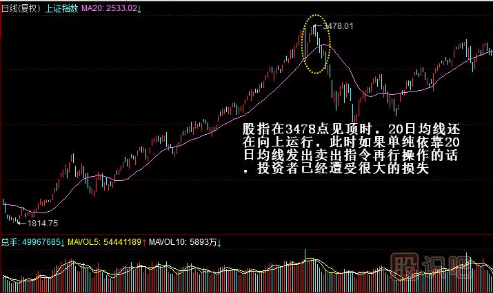 觀(guān)察圖2,我們看到當股指在3478點(diǎn)見(jiàn)頂時(shí),K線(xiàn)圖中已經(jīng)出現了見(jiàn)頂K線(xiàn)組合(黃昏之星)。但20日均線(xiàn)仍在向上運行,這表明此均線(xiàn)對于股指或股價(jià)的短期變化反映過(guò)慢,此時(shí)如果僅僅依靠20日均線(xiàn)發(fā)出賣(mài)出指令再行操作的話(huà),相信不少投資者已經(jīng)遭受損失。因此我們在判斷股指或股價(jià)后期如何發(fā)展時(shí)要結合5日均線(xiàn),K線(xiàn)形態(tài)、MACD指標、布林線(xiàn)等其他技術(shù)指標進(jìn)行綜合分析。
