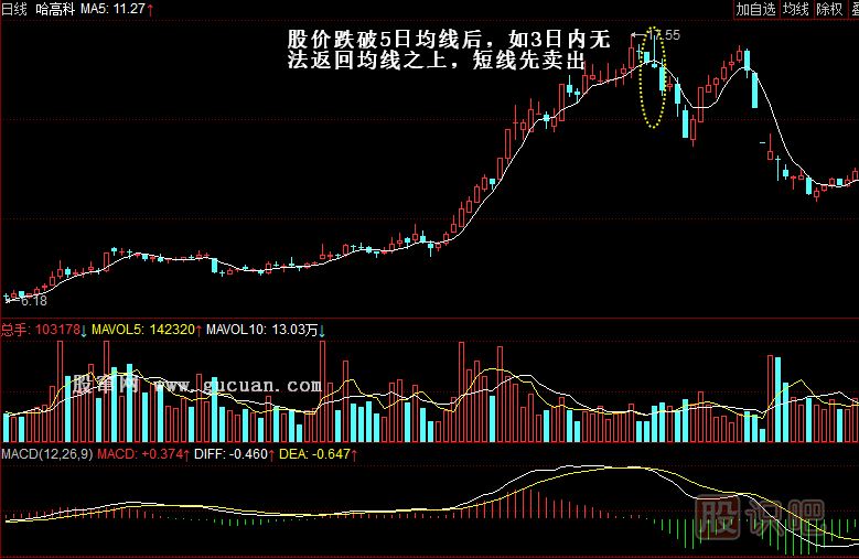 觀(guān)察圖5所示,此股股價(jià)在跌破5日均線(xiàn)之后,雖然連續3日盤(pán)中擊穿5日均線(xiàn)的壓制,但在收盤(pán)時(shí)卻都又跌回到5日均線(xiàn)之下,此時(shí)5日均線(xiàn)在股價(jià)的拖累下由向上運行開(kāi)始轉為掉頭向下。5日均線(xiàn)向下拐頭預示著(zhù)短期行情的走弱,因此對于短線(xiàn)投資者來(lái)說(shuō),應先賣(mài)出股票為宜。