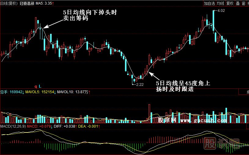 (5)當短線(xiàn)投資者利用5日均線(xiàn)進(jìn)行選股時(shí),只要發(fā)現所關(guān)注個(gè)股5日均線(xiàn)運行的角度能呈45度左右,就完全可以利用股價(jià)在回踩此均線(xiàn)位置時(shí)跟進(jìn)。