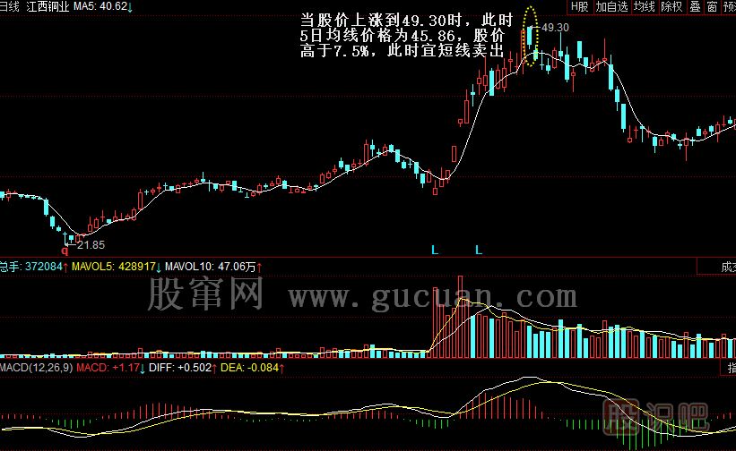 觀(guān)察圖1所示個(gè)股,股價(jià)從啟動(dòng)到進(jìn)入上升趨勢,一直沿5日均線(xiàn)向上運行,當股價(jià)上漲到49.30的價(jià)位時(shí),此時(shí)5日均線(xiàn)價(jià)格為45.86,股價(jià)與5日均線(xiàn)的偏離值為7.5%,按前面所講股價(jià)偏離超過(guò)5日均線(xiàn)7%時(shí),就可考慮短線(xiàn)賣(mài)出。