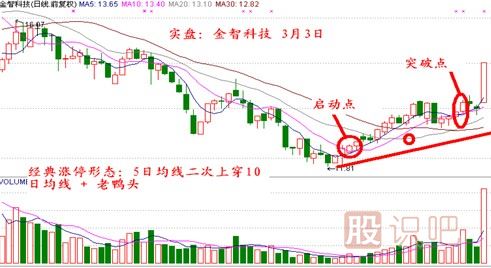3月3日金智科技和寧波海運出現標準的5日均線(xiàn)二次上穿10日均線(xiàn)的漲停走勢,從圖中可以發(fā)現兩只股票從前期高位一路下跌后,在低位形成止跌穩起,而成交量出現大幅萎縮,在第一個(gè)圓圈區域5日均線(xiàn)首次上穿10日均線(xiàn)(啟動(dòng)點(diǎn)),在縮量震蕩回調后出現2次上穿均線(xiàn)(突破點(diǎn)),伴隨而來(lái)的是經(jīng)典老鴨頭形態(tài),同時(shí)也是我們期望的一個(gè)漲停板!