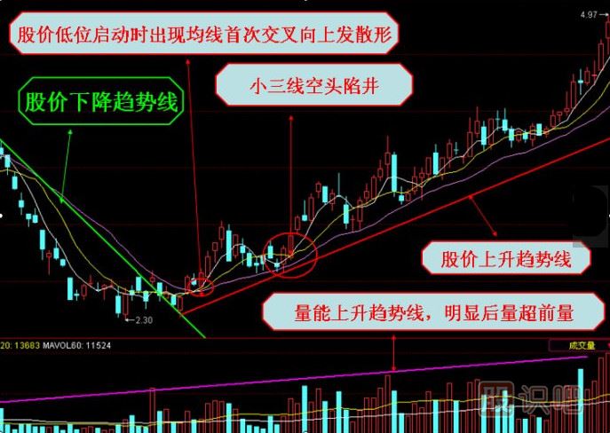 2,股價(jià)連續大幅回調之后,相對低位啟動(dòng)上攻行情時(shí),均線(xiàn)首先出現首次交叉向上發(fā)散形,隨后出現均線(xiàn)空頭陷阱,后市股價(jià)震蕩走高