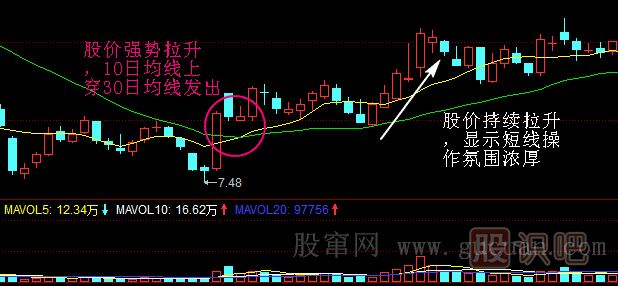 1、在股價(jià)強勢拉升,且30日均線(xiàn)上穿60日均線(xiàn)形成金叉時(shí),顯示股價(jià)持續上漲的信號,投資者可短線(xiàn)追漲。