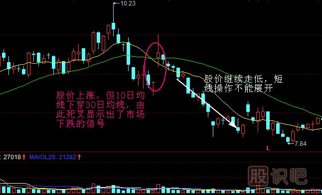 如上圖所示,該股在橢圓區域出現了較大幅度的單日反彈,但是死叉依舊存在,從10日均線(xiàn)下穿30日均線(xiàn)可知,該反彈無(wú)法成功扭轉走勢中的整體下跌局面。