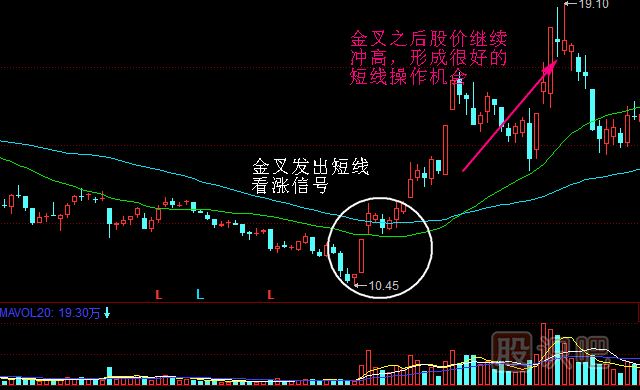 如上圖所示,當均線(xiàn)形成金叉之后,股價(jià)持續拉升,這樣的上漲顯示了金叉信號的準確性,短線(xiàn)操盤(pán)者若能積極參與其中必能獲利。