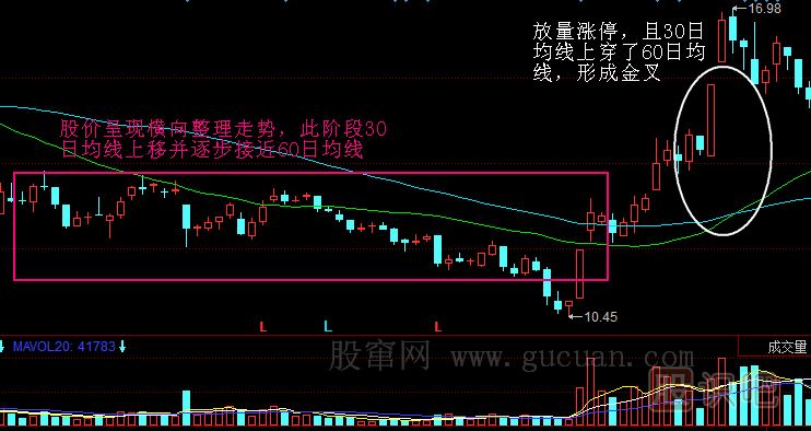 從圖中可以看出,該股先是出現了持續一段時(shí)間的橫向整理然后股價(jià)開(kāi)始緩慢上漲,隨后在橢圓區域股價(jià)強勢放量漲停,且30日均線(xiàn)已經(jīng)上穿了 60日均線(xiàn),由此發(fā)出了金叉買(mǎi)入信號,其后期走勢看漲。