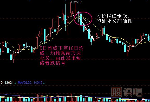 從圖中可以看到,該股從高處的25.93元持續下跌至20元附近,下跌幅度達到了20%以上,由此印證了均線(xiàn)死叉信號的準確性,短線(xiàn)投資者若不及時(shí)拋出股票必將慘遭損失。