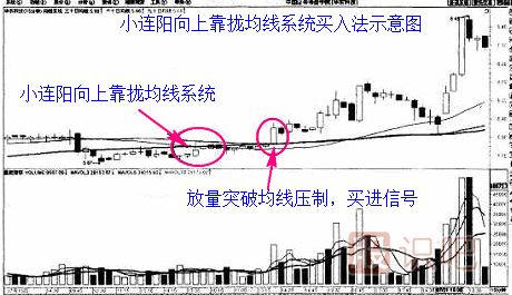 第一種 小連陽(yáng)向上靠攏均線(xiàn)系統買(mǎi)入法