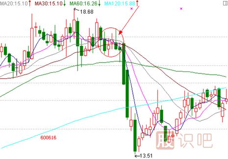 這是最近上證A股的日線(xiàn)圖,2009年12月17日和2010年1月20日兩次均線(xiàn)最佳賣(mài)點(diǎn),都是巨陰線(xiàn)如斷頭鍘刀般把均線(xiàn)拐頭砸向下方,短線(xiàn)跌幅500點(diǎn)左右,對個(gè)股來(lái)說(shuō)跌幅絕對巨大,早一點(diǎn)識別風(fēng)險可以避免不少損失。