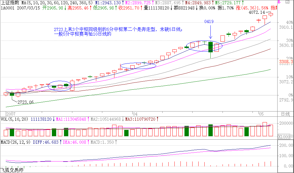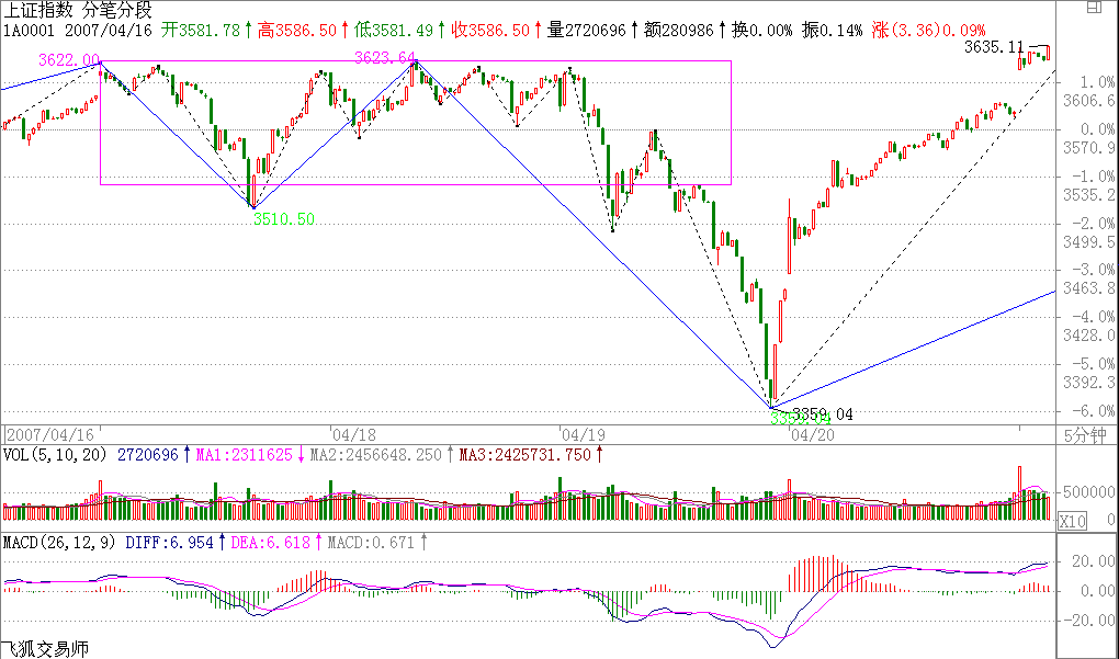 一個(gè)很顯然的道理,對市場(chǎng)了解越多,對走勢的把握越精確。例如,昨天20070419的2007年一夜情行情,跌破5日線(xiàn)后有一個(gè)反抽,在11點(diǎn)08剛好構成對前一天中樞的第三類(lèi)賣(mài)點(diǎn),這就是最后的、被本ID理論所保障的離開(kāi)機會(huì )。那么,后面去走,就完全與本ID的理論無(wú)關(guān)了,在一個(gè)下跌里,除了最后那一個(gè)位置,所有的賣(mài)出都是對的,但這和本ID的理論無(wú)關(guān),這類(lèi)似賭博,就賭不是最后的位置。當然,賭博也是一種方法,但這種把握,不在本ID的討論范圍內。
