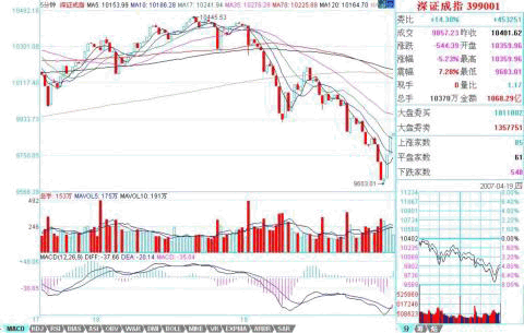 對于一個(gè)跌破中樞的下跌來(lái)說(shuō),第三類(lèi)賣(mài)點(diǎn)后再來(lái)兩波就可以隨時(shí)完美。這個(gè)完美,由于該下跌是1分鐘以下級別的,因此從該下跌的細部,是找不到根據1分鐘背弛去確認的買(mǎi)點(diǎn)的,只可能根據分筆背馳。而根據預先知道的中樞震蕩看法,唯一需要確認的是,1330后的下跌與1030前下跌的力度比較。從5分鐘MACD兩柱子面積的比較可以看到,前者并不比后者的力度大,這一點(diǎn),參考看深圳成指的圖就更明顯了(請看下圖)。所以,可以斷言,這1330開(kāi)始的下跌,一定會(huì )有強力回拉。