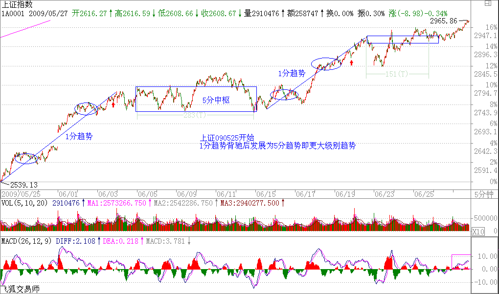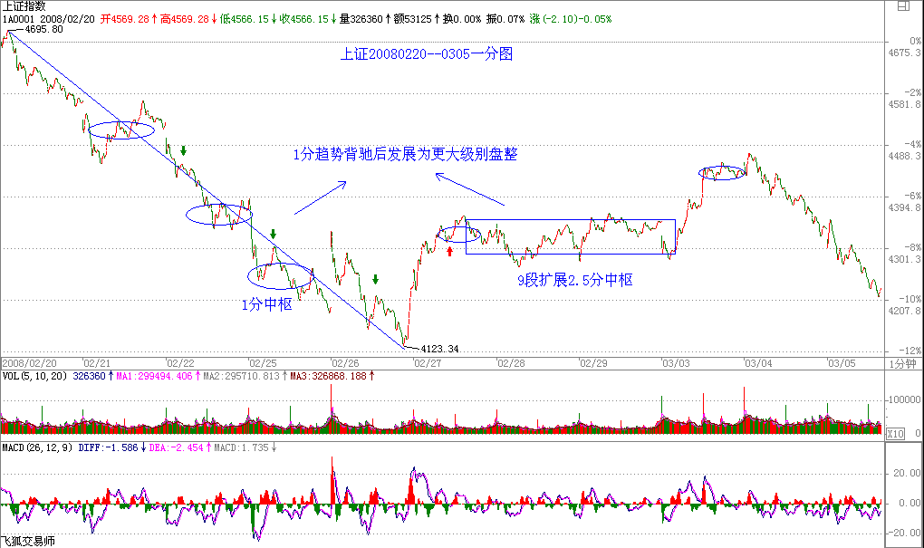 該定理的證明有點(diǎn)抽象,估計大多數的人都沒(méi)興趣,那就用一個(gè)例子來(lái)說(shuō)明,也大致知道證明的輪廓,更重要的是,這樣,各位對走勢的形成有一個(gè)更深切的認識。例如,一個(gè)5分鐘背馳段的下跌,最終通過(guò)1分鐘以及1分鐘以下級別的精確定位,最終可以找到背馳的精確點(diǎn),其后就發(fā)生反彈。注意,反彈只是一般的術(shù)語(yǔ),在本ID的理論中,對這反彈會(huì )有一個(gè)很明確的界定,就是包括三種情況:一、該趨勢最后一個(gè)中樞的級別擴展、二、該級別更大級別的盤(pán)整、三該級別以上級別的反趨勢。