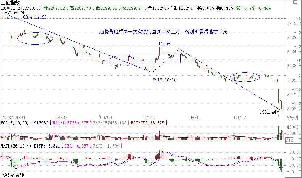 對于5分鐘級別趨勢發(fā)生背馳的情況,那這個(gè)5分鐘級別的趨勢里所具有的中樞都是5分鐘級別的,假設共有N個(gè),顯然,這個(gè)N>=2??紤]最后一個(gè)中樞的情況,最后的背馳段,跌破該中樞后,該背馳段顯然是一個(gè)1分鐘以下級別的走勢,否則就和該中樞是5分鐘級別趨勢的最后一個(gè)中樞的前提矛盾了。該背馳段出現第一類(lèi)買(mǎi)點(diǎn)發(fā)生反彈,顯然,該反彈一定觸及最后一個(gè)中樞的DD=min(dn),也就是圍繞該中樞震蕩的最低點(diǎn),否則,如果反彈連這都觸及不了,就等于在下面又至少形成一個(gè)新的5分鐘中樞,這與上中樞是最后一個(gè)矛盾。這種只觸及最后一個(gè)中樞的DD=min(dn)的反彈,就是背弛后最弱的反彈,這種反彈,將把最后一個(gè)中樞變成一個(gè)級別上的擴展,例如,把5分鐘的中樞擴展成30分鐘甚至更大的中樞。