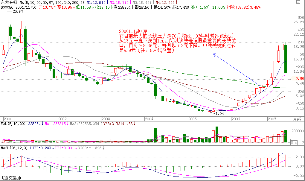 至于你說(shuō)的600086,它已經(jīng)長(cháng)了很多了,連續拉了8個(gè)月的陽(yáng)線(xiàn)從1塊多長(cháng)到7塊多,出現調整是最正常不過(guò)了纏中說(shuō)禪博客敘說(shuō)給賺了指數虧了錢(qián)的一些忠告。關(guān)鍵是你買(mǎi)的位置,如果你是最近才買(mǎi)的,對面臨的調整風(fēng)險就要有所承受。本ID現在只能告訴你它現在的具體狀況。它目前最大的長(cháng)線(xiàn)壓力是70月均線(xiàn),03年時(shí)曾碰該線(xiàn)后從13元一直下跌到1元,所以該線(xiàn)是該股最重要的長(cháng)線(xiàn)關(guān)口,目前在8.36元,每月以0.3元下降。中線(xiàn)關(guān)鍵的點(diǎn)位是5.9元(注:5月線(xiàn)位置),該位置不能有效跌破,否則調整的幅度會(huì )很大。目前可以看成是5